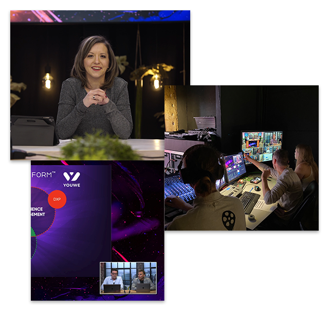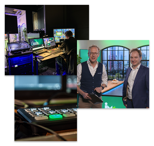 Afhankelijk van jouw wensen kunnen we alle indelingen, decors en sferen realiseren, helemaal in jullie huisstijl. Maar wil je jullie eigen locatie benutten, dan richten we een tijdelijke studio in. Compleet met decor, camera’s, regietafel en technici.